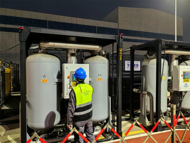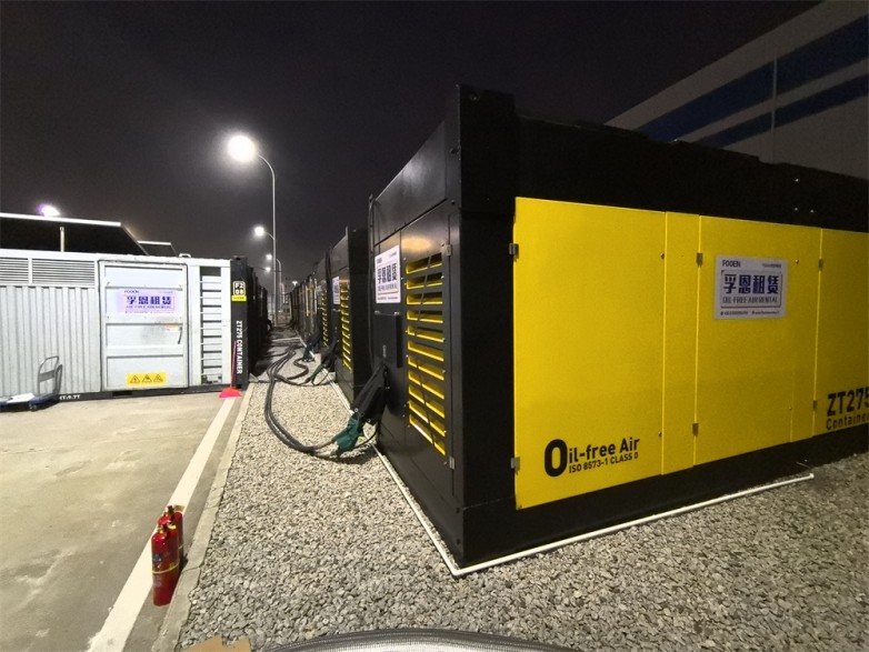 在此次密封性試驗中,孚恩租賃為其提供了9套頂級無油空壓機組,并派遣8名專業技術服務工程師常駐現場,從現場勘查、設備入場、安裝調試、供氣打壓直至設備離場,全程嚴格執行高標準作業流程,助力項目方于3月8日凌晨順利完成了安全殼打壓任務。